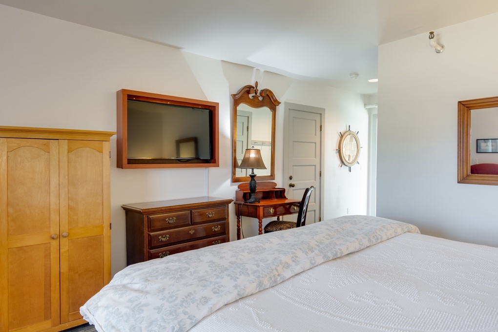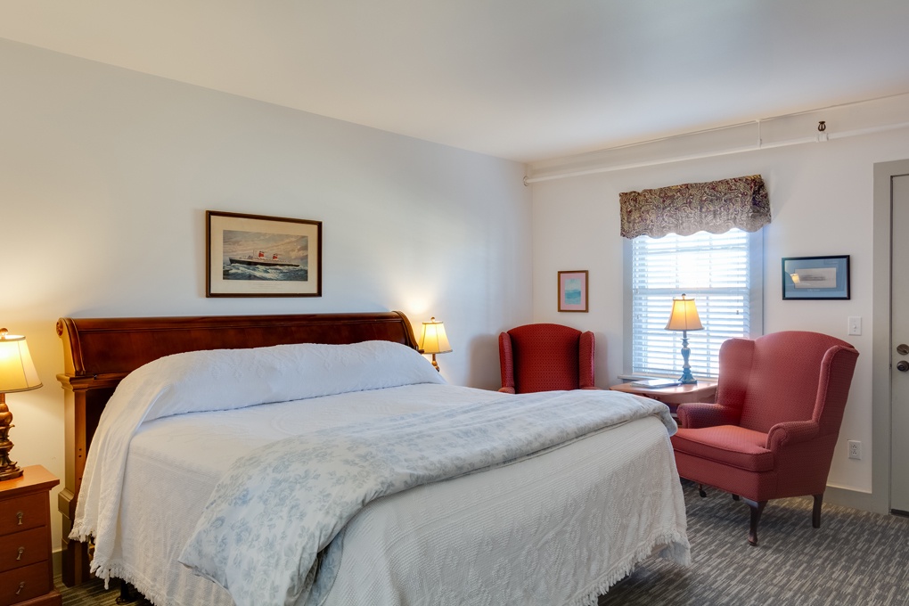 The Roger Bailie Room has a king-sized bed with handmade cherry panel headboard. The room has a refrigerator, microwave, flat screen television. There is also a private bathroom, heated towel bar and room safe. Room 2 is on the 1st Floor, northwest center and connects to Room 3. Additional room features include a Keurig coffee maker, hair dryer, iron and ironing board.