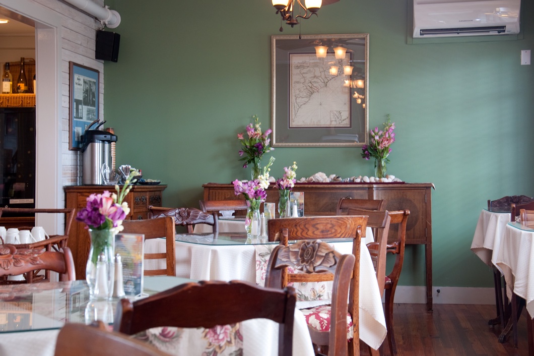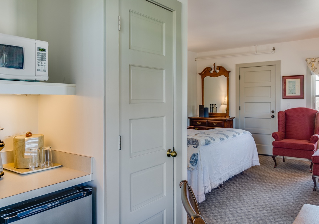 The Ananias Dare Room features a king-sized pediment bed. Amenities include a refrigerator, microwave, flat screen television, in room safe and heated towel bar in the private bath. Room 5 is on the 1st Floor, southwest center, on the sound side. Additional room features include a Keurig coffee maker, hair dryer, iron and ironing board.