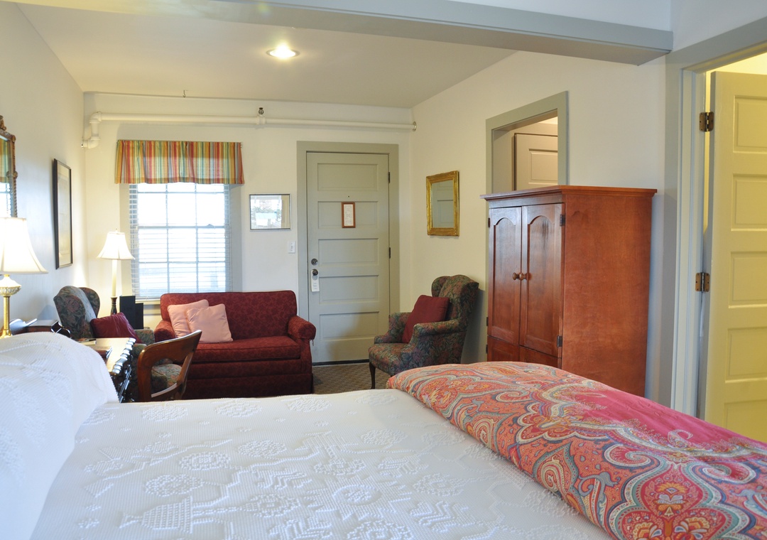 The George Howe Room has a king-sized bed with French marquetry headboard. The room has a small kitchenette in a separate alcove. It is on the 2nd Floor, center, with partial sound and ocean views. It also has an interior door connecting to the Virginia Dare Library. Other amenities include a sofa bed, flat screen television, in room safe and heated towel bar in the private bath. Additional room features include a Keurig coffee maker, hair dryer, iron and ironing board.