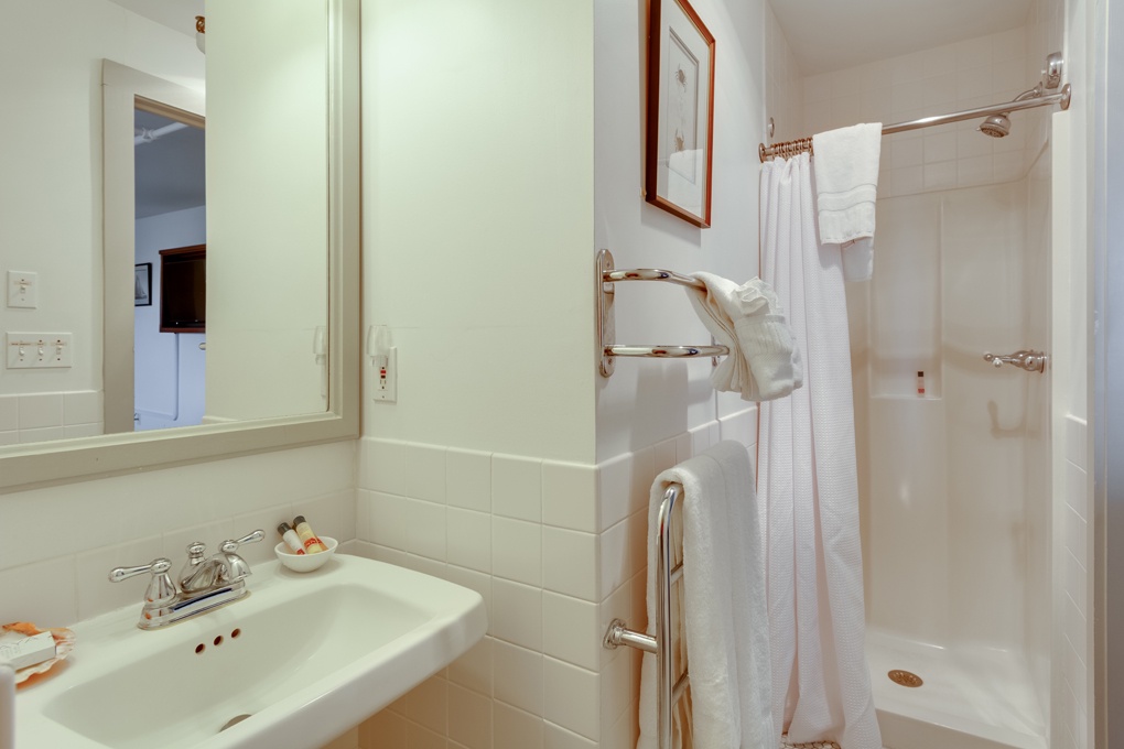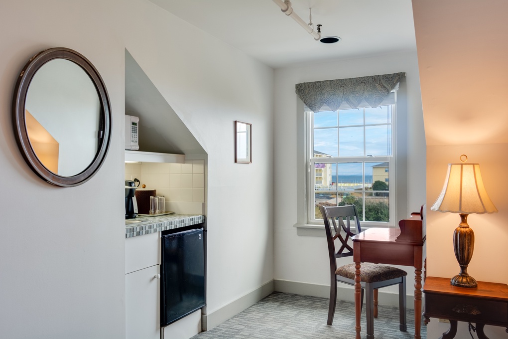 The John Spendlove Room features a queen-sized bed with a panel headboard and private bath with heated towel bar. The room has a wetbar with a refrigerator and microwave, 40 inch smart flat screen television and in room safe. It is on the 3rd Floor, northeast center, with an ocean view. Note: shower stall only in the bath. Additional room features include a Keurig coffee maker, hair dryer, iron and ironing board.