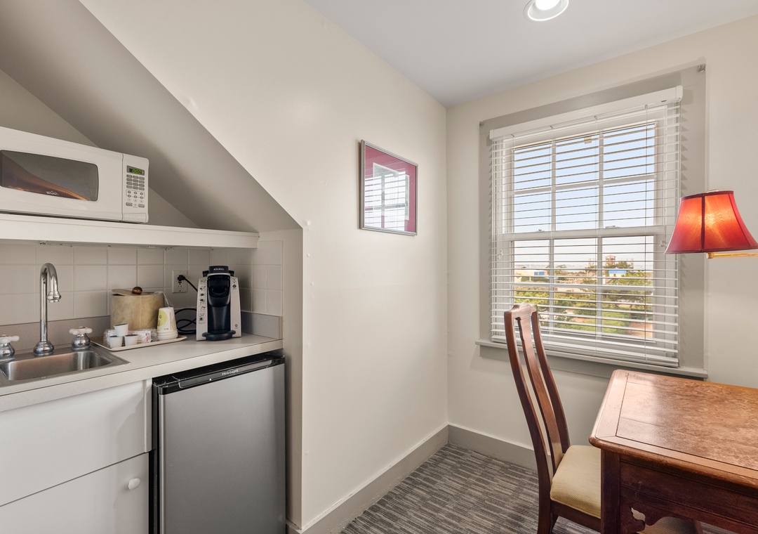 The Martyn Sutton Room has a queen-sized Jenny Lind pine bed with wicker furnishings. Room 23 features a wet bar with a microwave and refrigerator, 40 inch smart flat screen television, in room safe and heated towel bar in the private bath. Note: shower stall only in the bath. It is on the 3rd Floor, southwest center, on the sound side. You do have views of the sound and sunset. Additional room features include a Keurig coffee maker, hair dryer, iron and ironing board.