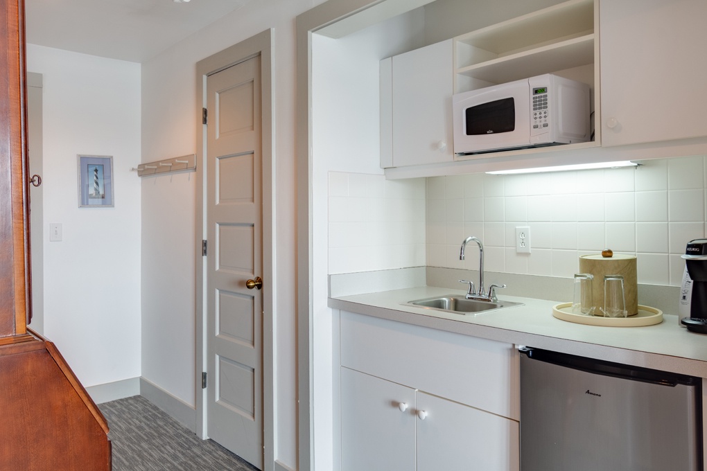 The Agnes Wood Room offers a queen-sized cherry cannonball bed with roll away trundle bed, wicker tables and comfortable lounge chairs. The room has a private bath with heated towel bar, a screened south-facing balcony, wetbar with microwave and refrigerator. Also includes a flat screen television and in room safe. Room 26 is located on the 3rd Floor, center, and connects to Room 25. Additional room features include a Keurig coffee maker, hair dryer, iron and ironing board.